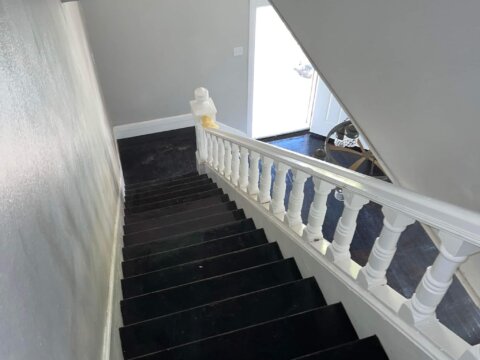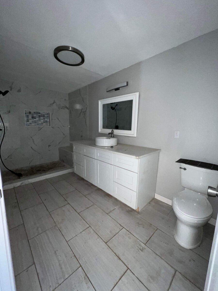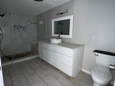 Tiled kitchen floors, chic grey walls, subway tile backsplash, black cabinet pulls, brand new cabinets, customized island that can seat barstools, and TONS of lighting! Right off the kitchen you will find the washer dryer hookups and a walk in pantry. The door to the backyard is on the other side of the kitchen and leads to a large back yard and a private deck! Upstairs you will find 4 large rooms all with their own walk in closets and another full bath.